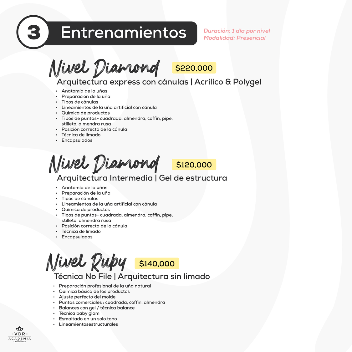 Contamos con una formación completa y especializada, organizada por niveles, para que elijas según tu experiencia y objetivos profesionales. Cada entrenamiento está diseñado para perfeccionar técnica, estructura y tiempos de trabajo.